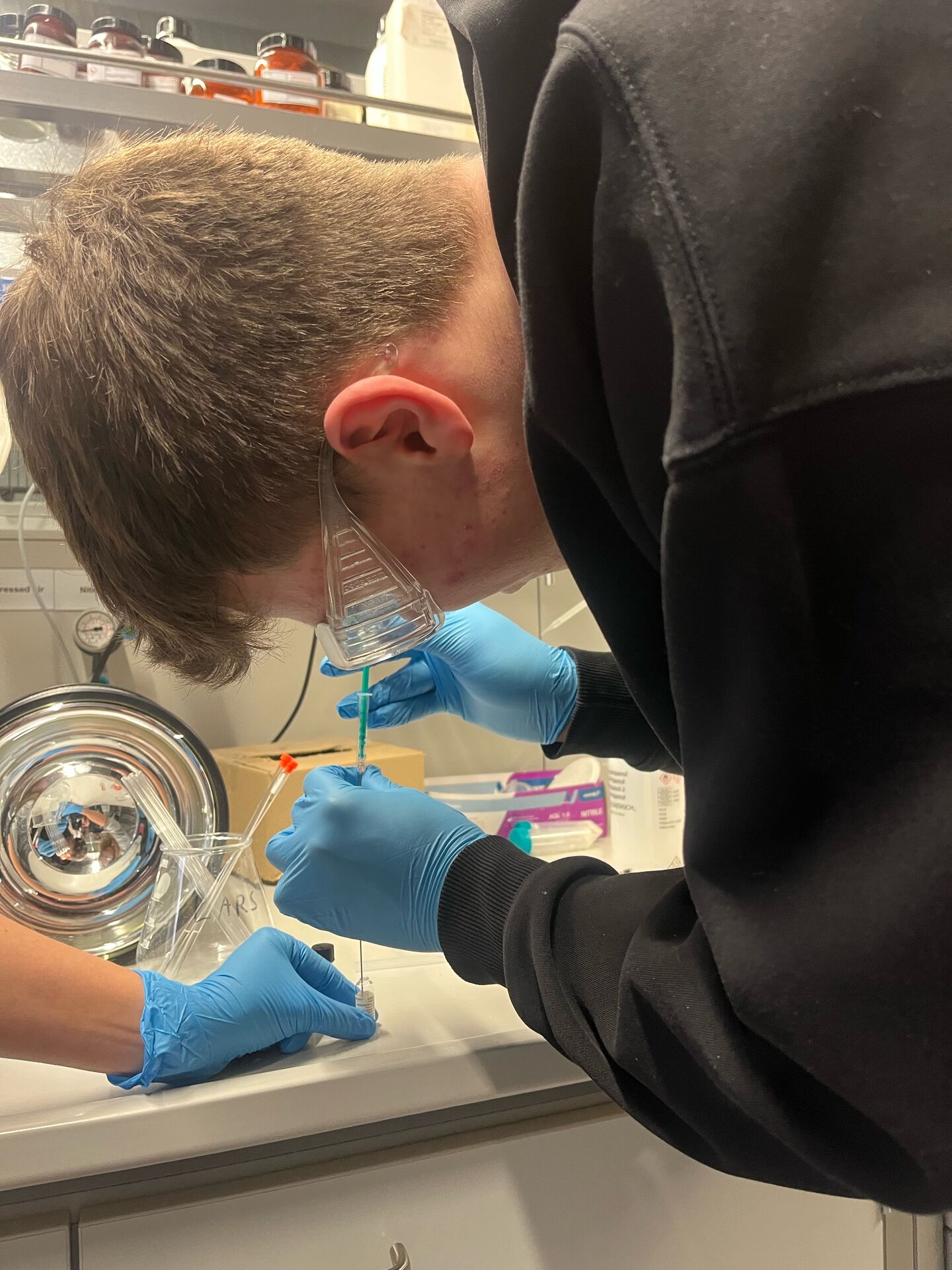 Frau Prof. Dr. Pöppler vom Lehrstuhl für Strukturelle organische Chemie hat den Leistungskurs Chemie (Q12) bei einem Besuch am 18.12. 2025 mit in die faszinierende Nanowelt der NMR-Strukturaufklärung genommen. Anschließend durften wir ein Labor besichtigen, selbst verschiedene Proben für Festkörper und Flüssig-NMR-Messungen vorbereiten und die von uns mitgebrachten Proben am NMR-Gerät messen.: Für die Jugend forscht Arbeit eines Kursmitgliedes wurden Extrakte von verschiedenen Pflanzen mittels 13F -NMR auf sogenannte PFAS untersucht (das sind sogenannte "Ewigkeitschemikalien", die unter anderem in Löschschäumen und wasserabweisender Sportkleidung und Backpapier zum Einsatz kommen/kamen, deren Auswirkungen auf die Umwelt aber noch nicht abschätzbar sind). Ob wir PFAS gefunden haben kann man demnächst in der Projekt-Dokumentation von Paulus Arbeit beim Regionalwettbewerb nachlesen...