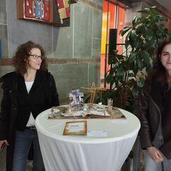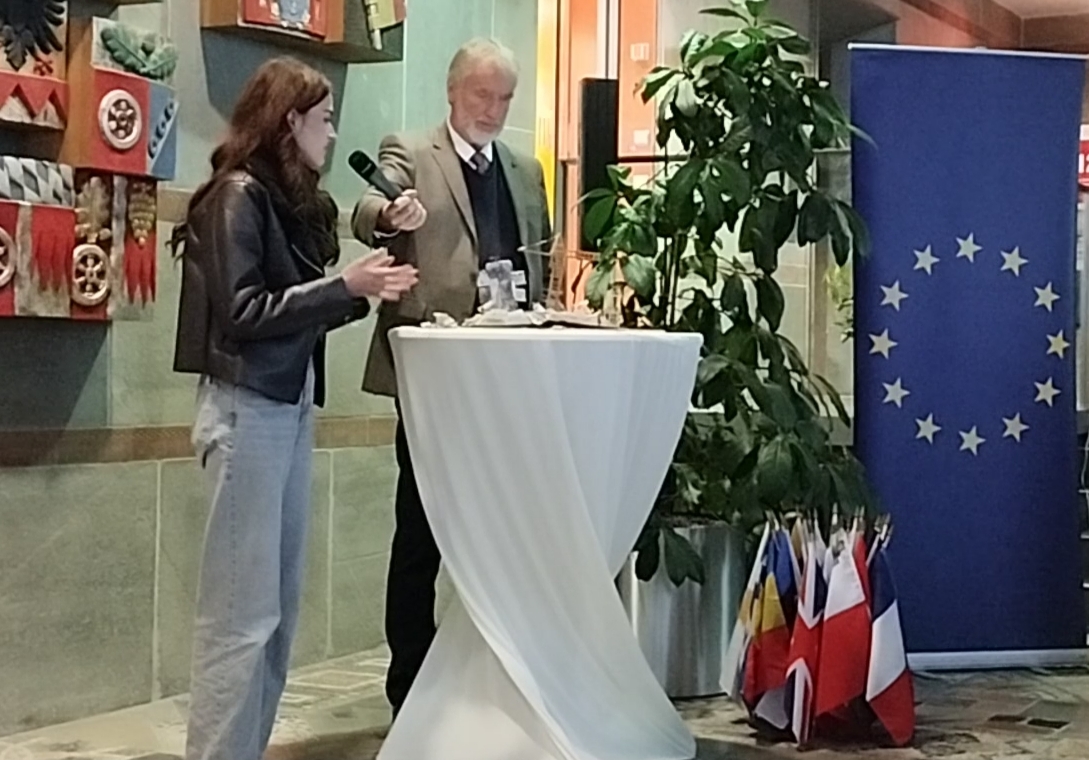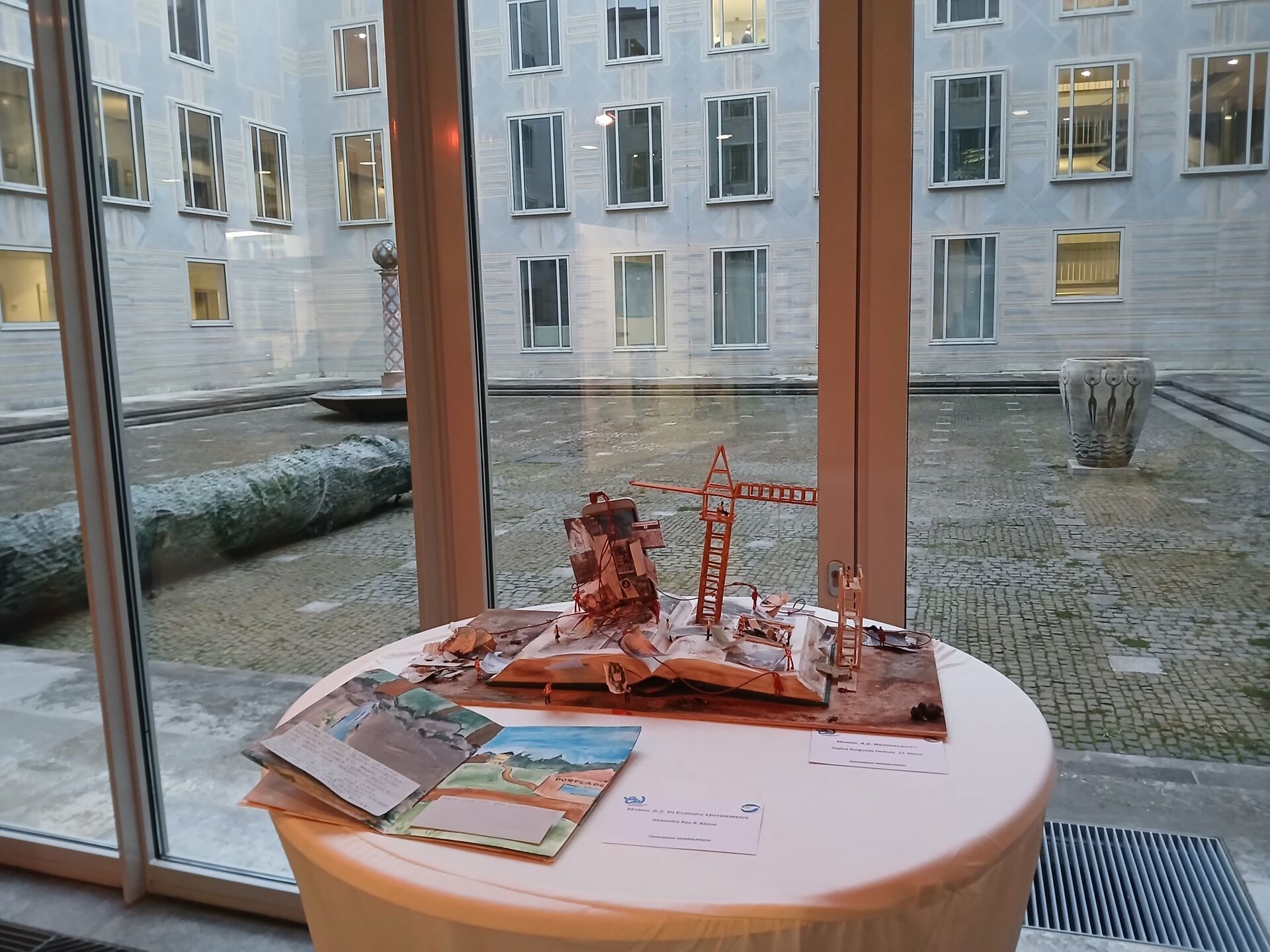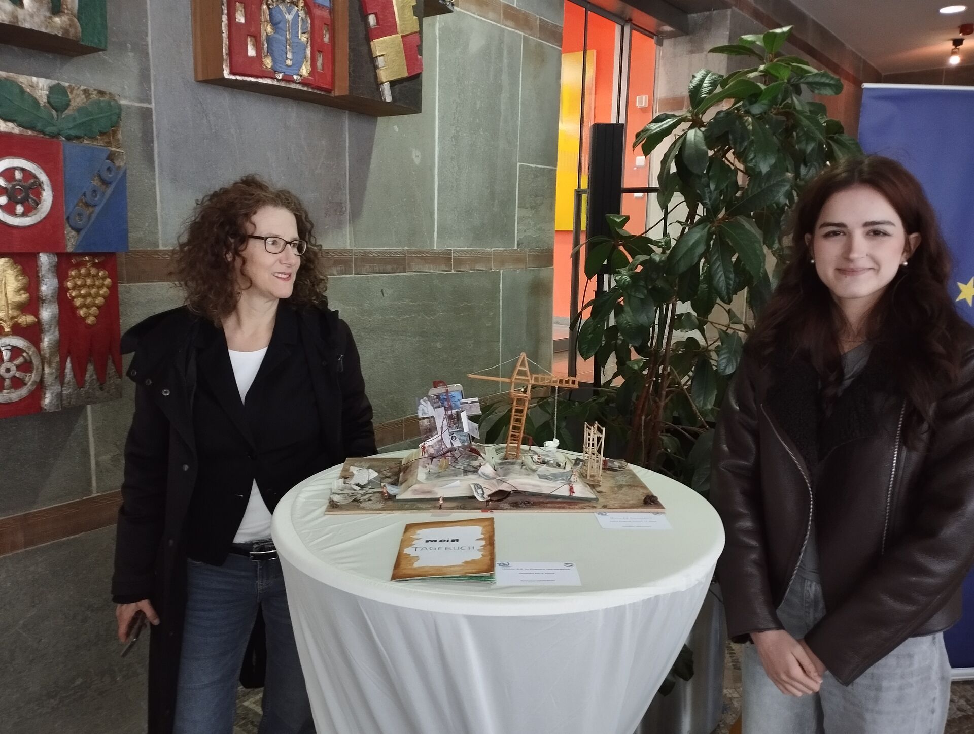 Sophia Demuß Q13 stellte sich den Fragen von Gerhard Luber, dem Schulbeauftragten der Europa-Union Unterfranken, zu ihrer Arbeit und darüber hinaus. Dabei zeigte sie einmal mehr, dass ihr Buchobjekt aus einer tiefen Reflexion zu Themen wie Wissensvermittlung und Wahrheit entstanden ist.
