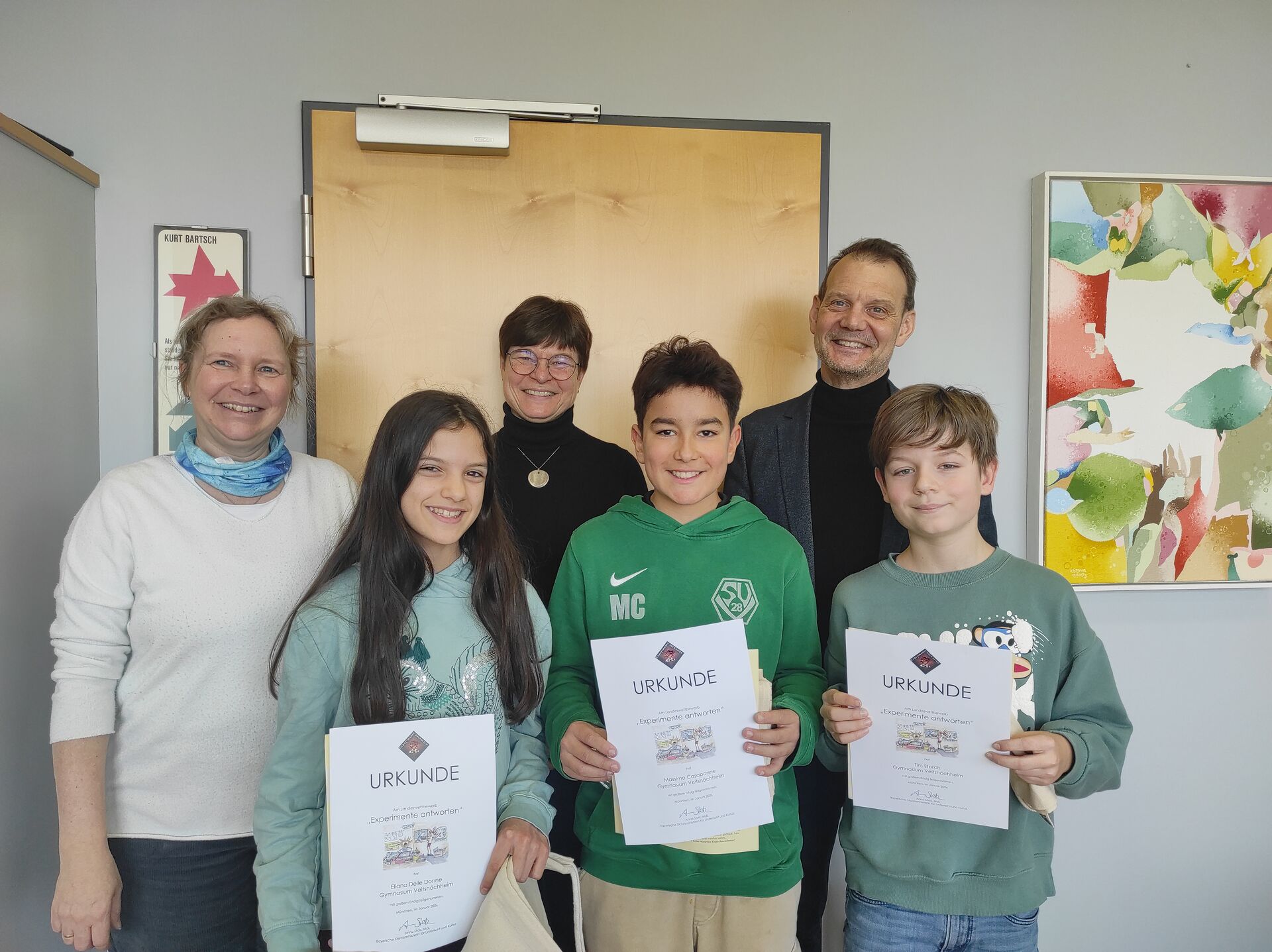 ...das ist ein vom Kultusministerium ausgelobter Landeswettbewerb, bei dem es darum geht, die Freude am Experimentieren und an den Naturwissenschaften zu wecken und den Nachwuchs für andere Wettbewerbe, wie z. B. für Jugend forscht fit zu machen. Eliana (6a), Massimo und Tim (beide 6b) sind da auf jeden Fall schon auf einem sehr guten Weg. Mit viel Ausdauer und Geduld haben die drei die Saugfähigkeit von Papier getestet und verschiedene Papiere selbst hergestellt und die Ergebnisse nachvollziehbar dokumentiert. Das hat die Jury begeistert! Herzlichen Glückwunsch!