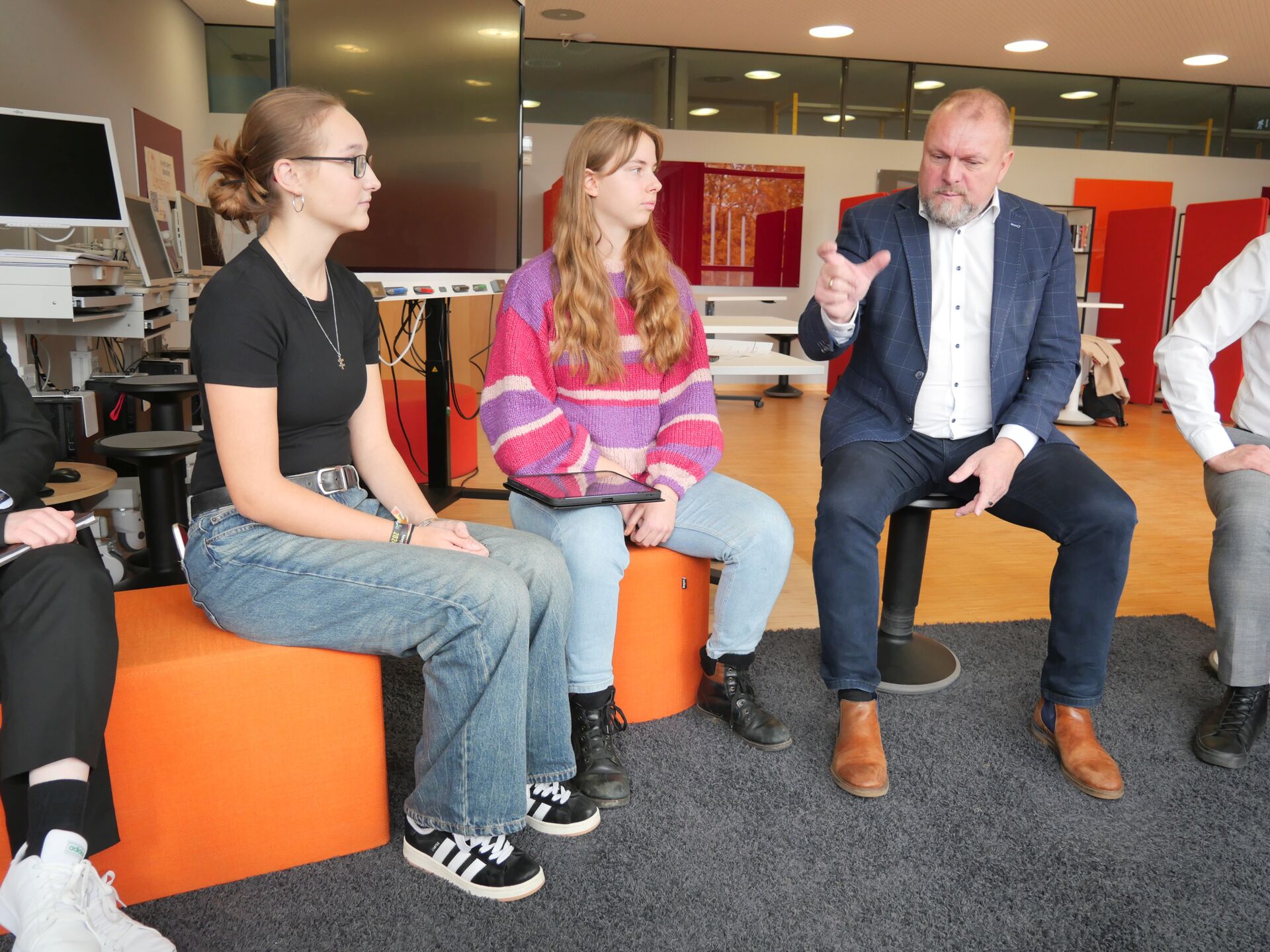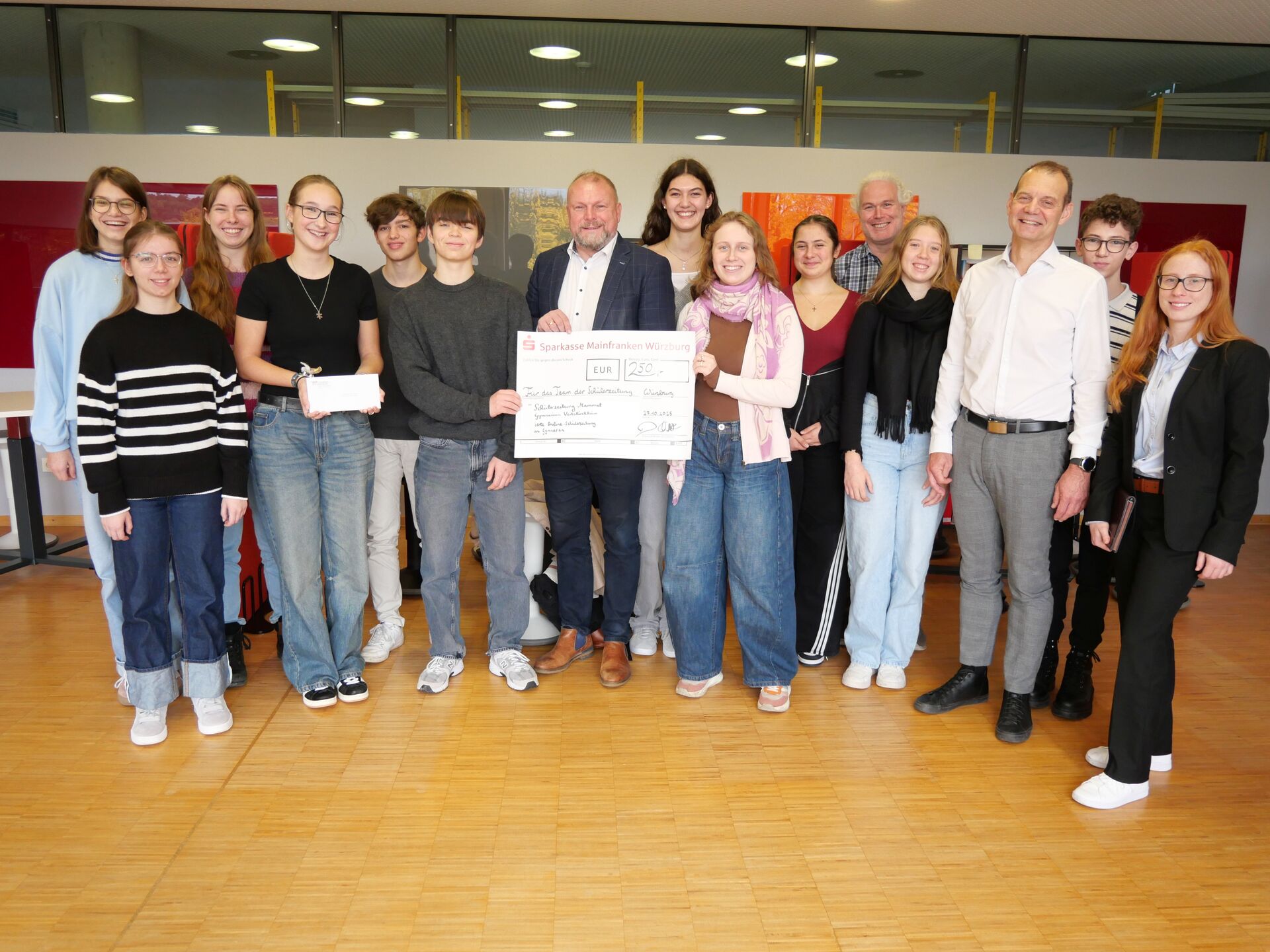 Der doppelte Erfolg blieb auch im Landratsamt Würzburg nicht unbemerkt: Landrat Thomas Eberth besuchte das Redaktionsteam kürzlich gemeinsam mit der Bildungsmanagerin des Landkreises Sinika Liebert, um den jungen Journalistinnen und Journalisten persönlich zu ihren herausragenden Leistungen zu gratulieren. Mit im Gepäck befand sich ein Scheck in Höhe von 250 Euro.