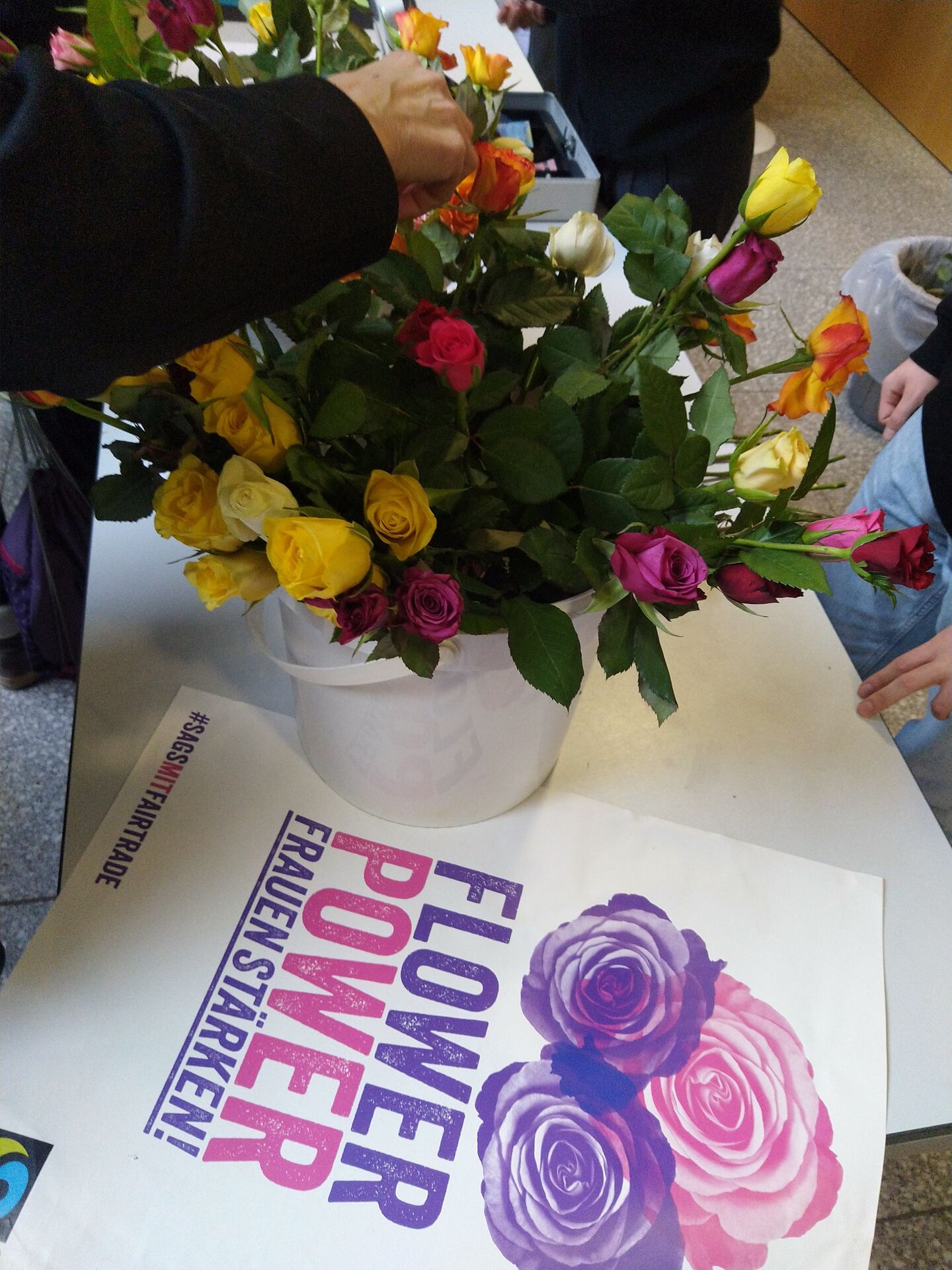 Der Verkauf von fairen Snacks an der Schule, wofür uns das Landratsamt immer den Verkaufswagen zur Verfügung stellt, gehört genauso zu unseren Aufgaben, wie der Verkauf fairer Rosen zum Valentinstag oder auch unser Engagement gegen Gewalt gegen Frauen.